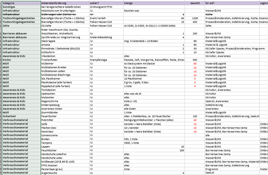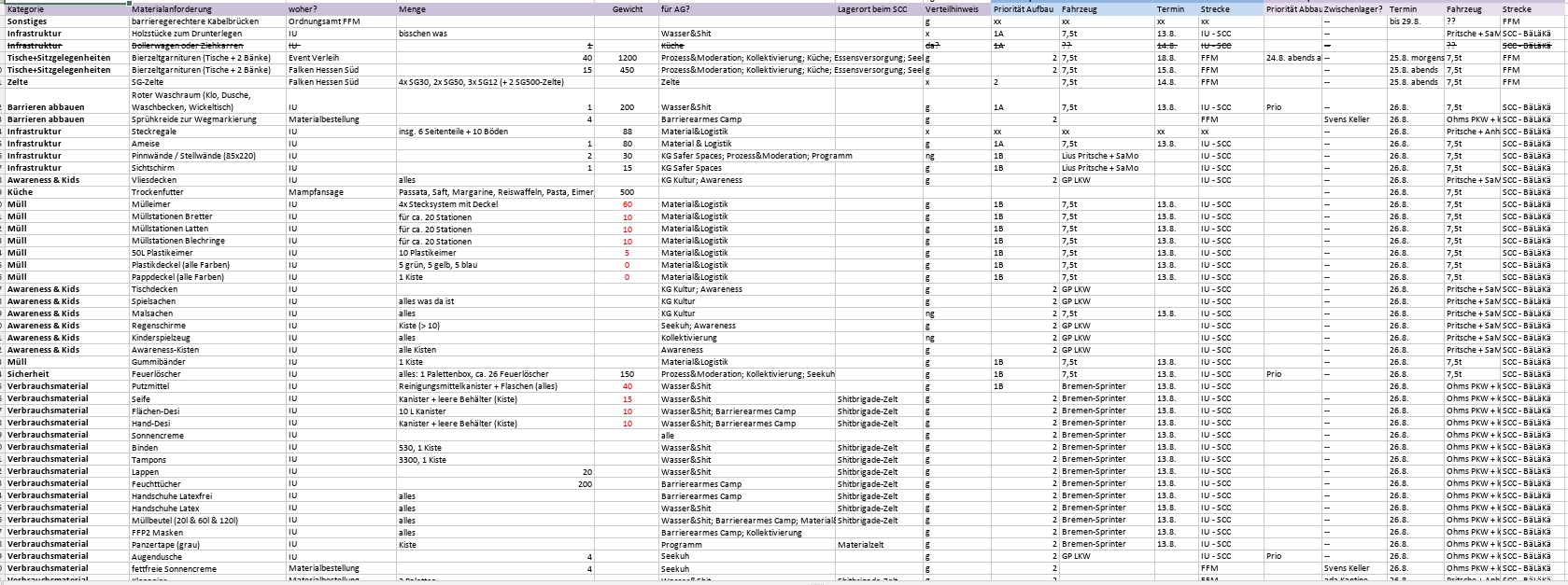 Das How-To soll euch helfen, das Material zu organisieren und die Logistik der Transporte für ein größeres Camp zu koordinieren :) Vielleicht kann der Leitfaden euch ein bisschen etwas an die Hand geben - aber das How-To wurde nach den Erfahrungen des System Change Camps 2025 erstellt. Dort gab es eine "Material- und Logistik-AG". Die Menschen in dieser AG haben sich um die Logistikplanung gekümmert - bei eurem Camp ist die Bezeichnung und vielleicht auch die Aufteilung der Aufgaben anders. Und bei kleineren Camps, bei denen es um einen Transport vom IU-Lager zum Camp und zurück geht, ist die Planung deutlich weniger komplex als hier beschrieben.