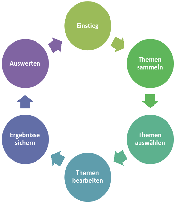 In der Einstiegsphase stehen Kennenlernen und organisatorische Fragen im Fokus. Hier werden Arbeitsweisen, Pausenzeiten etc. vereinbart. Beim Sammeln von Themen bringen die Teilnehmenden ein, welche Themen sie gerne bearbeiten möchten bzw. was sie für wichtig halten. Hier geht es aber nur um eine Auflistung und noch nicht darum, konkret in Themen einzusteigen. Da aber in der Regel nicht genug Zeit ist, um alles zu bearbeiten, müssen anschließend Themen ausgewählt werden. In diesem Schritt ist es wichtig, eine Auswahl zu treffen, die alle Beteiligten mittragen wollen. Im Anschluss erfolgt dann die konkrete Bearbeitung der Themen, also der Hauptarbeitsschritt. Danach ist es wichtig, die Ergebnisse zu sichern. Das meint nicht nur alles aufzuschreiben, sondern auch zu vereinbaren, was im Nachgang passieren soll, wer was bis wann erledigt, etc. Im letzten Schritt wird dann der gemeinsame Prozess ausgewertet. Was war besonders gut, was hätte besser klappen können, was wird beim nächsten Mal anders gemacht.